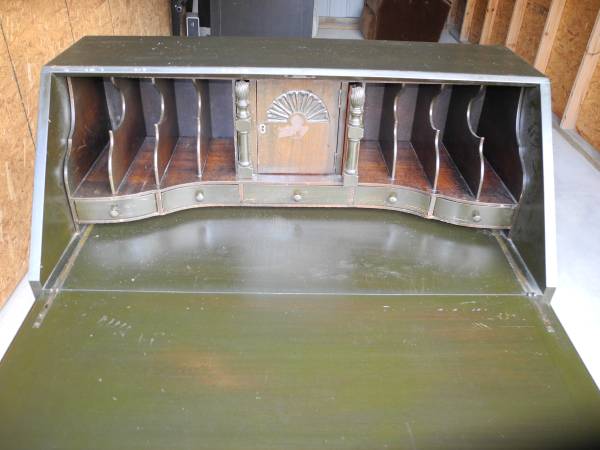 This is a fully functional antique secretary desk was made by the Union Furniture Company from Jamestown, NY. The fold-down writing shelf works perfectly. All the drawers slide as they should. There is no key but every drawer and the inside center storage compartment have locks. It has been repainted once. It has the potential to be a new Etsy project or use it as is.